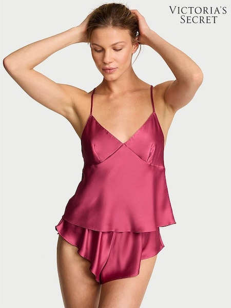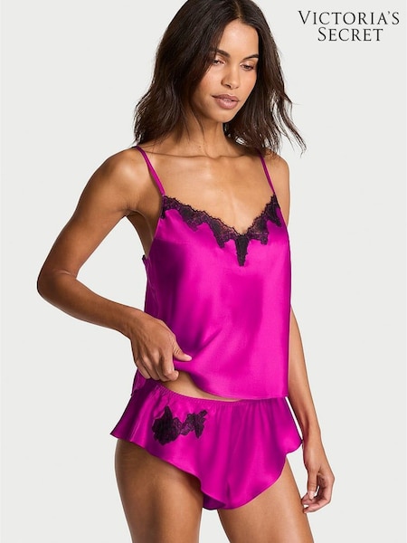 Victoria's Secret Berrylicious Purple Satin Rose Lace Trim Cami & Flutter Shorts Set