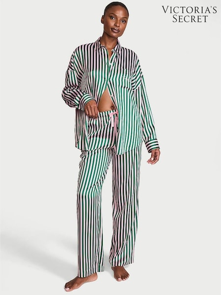 Victoria's Secret Green & Pretty Blossom Pink Stripe Satin Oversized Long Pyjama Set