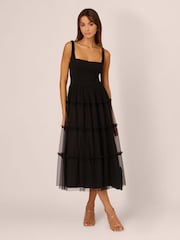 Modern fabric mixes make this classic fit and flare dress a sweet look. This midi dress features a fitted bodice with tank straps, a square neckline, and a tiered skirt. Fully lined, the bodice is crafted from a knit fabrication while the skirt is overlaid in mesh for added sweep. Pockets and a square back with centre zip closure complete this delightful party dress. Styled with nude heels and sparkling accessories, this midi dress is a timeless look from wedding guest duty to cocktail parties Dry clean only. 100% Polyester.